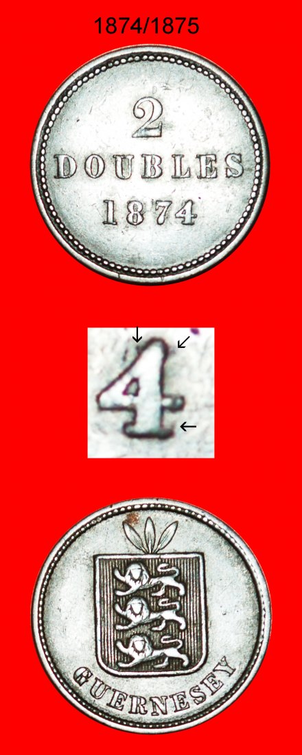 INTERESTING TYPE with a COIN alignment ↑↓ of Victoria (1837-1901) struck by Partridge & Co in Birmingham in attractive condition. Key date with lovely overdate: 4 over 5. Such overdates are not common, for usually the new date is made over early years, but not over future. The only variety with date 1875! This uncommon variety was confirmed in 1971 only. The early type of country spelling:GUERNESEY instead of GUERNSEY.
