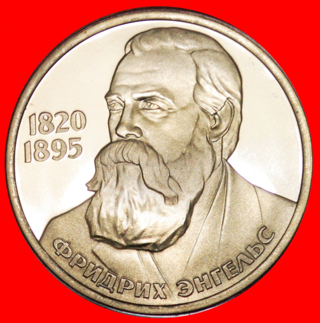 This coin is dedicated to ENGELS (1820-1895) the ideological inspirer of the country on occasion of 165th anniversary of his birth. It is of the uncommon type in scarce PROOF condition. For the mintage in PROOF was small and due to high demand by collectors the coinage was repeated in 1989 bearing the new edge inscription: ОДИН РУБЛЬ • 1988 • Н •. This coin is of the variety struck in 1985 with the edge: ОДИН РУБЛЬ • ОДИН РУБЛЬ •