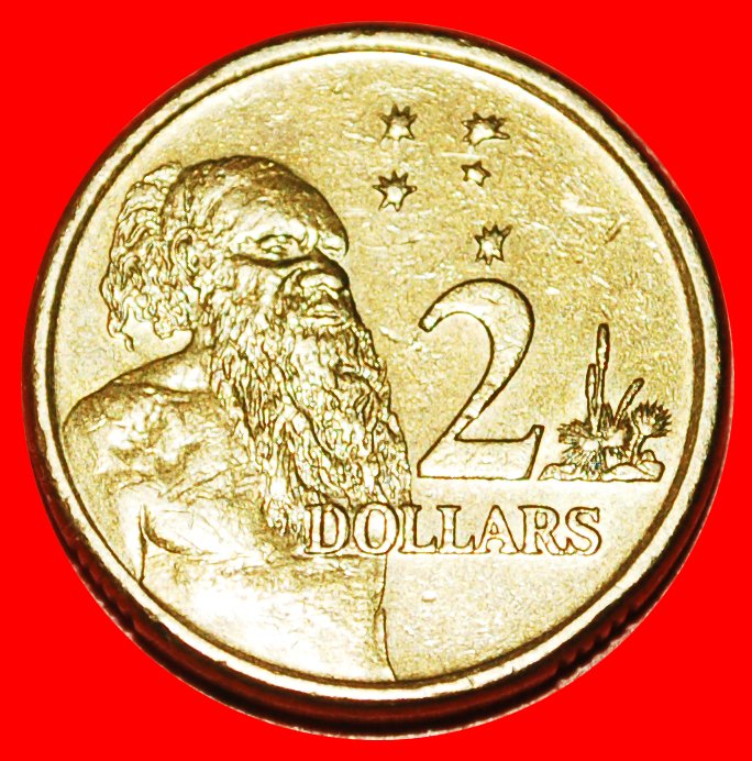 A male Aboriginal Elder, 5 stars of Crux and native grasstrees. Interesting coin in nice condition. Interesting fact.The Australian two dollar coin was introduced on 20 June 1988 replacing the $2 note that was withdrawn from circulation. As with the one dollar paper note, the $2 note had a short service life and replacement with a coin was very cost effective. The Australian 2 dollar coin standard design is that of an Aboriginal elder and was the only design used until now.