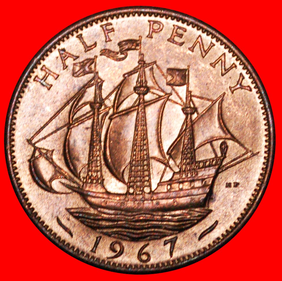* SCHIFF (1954-1970): GROSSBRITANNIEN ★ 1/2 PENNY 1967 STG STEMPELGLANZ! BREITER RAND! UNGEWÖHNLICH! ELISABETH II. (1953-2022) OHNE VORBEHALT!