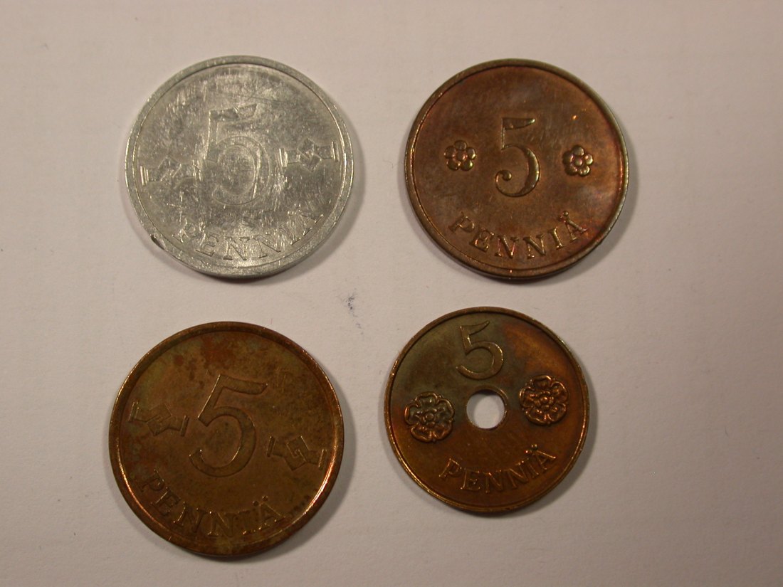 H15 Finnland 5 Penniä 4 versch. Typen und Jahre Originalbilder