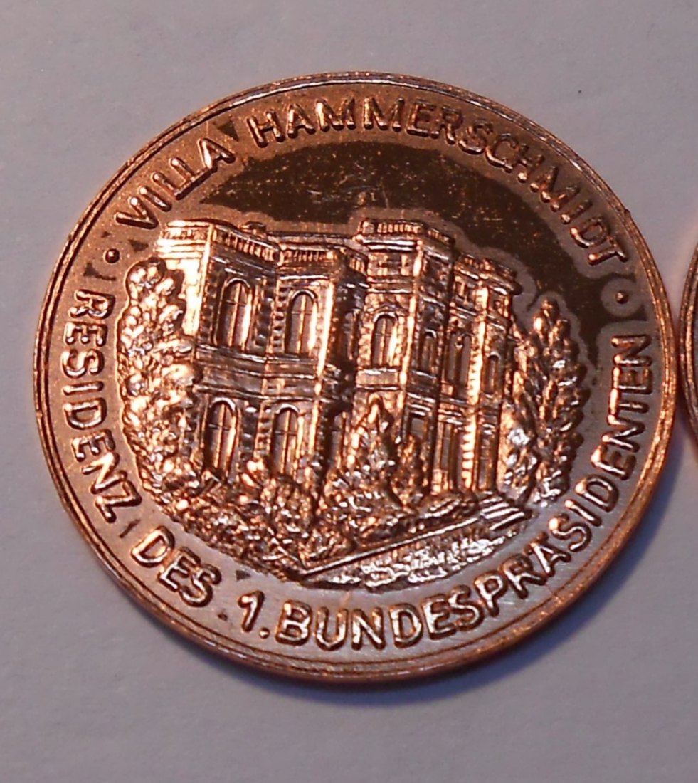 K2.Kupfer- kleine Medaille 100 Jahre Theodor Heuss 1984 „1. Deutscher Bundespräsident“, auf der Rückseite Abbild der Villa Hammerschmidt Berlin, Material Kupfer, d=18mm, Gewicht 2,25 g
